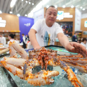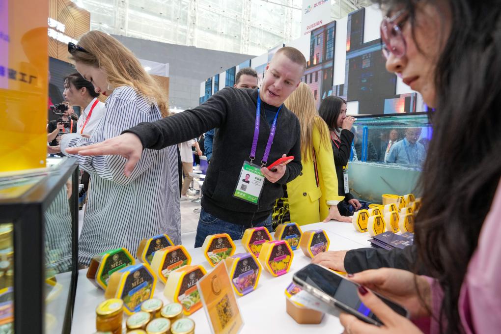 俄罗斯滨海边疆区展区的设置,让人仿佛穿梭于深海与城市间。帝王蟹、扇贝、青口等海产品吸引众多客商驻足;展区另一侧,从蜂蜜、红酒到巧克力、香肠,琳琅满目的展陈和贴心的试吃体验,让观展者大呼“有口福了!”