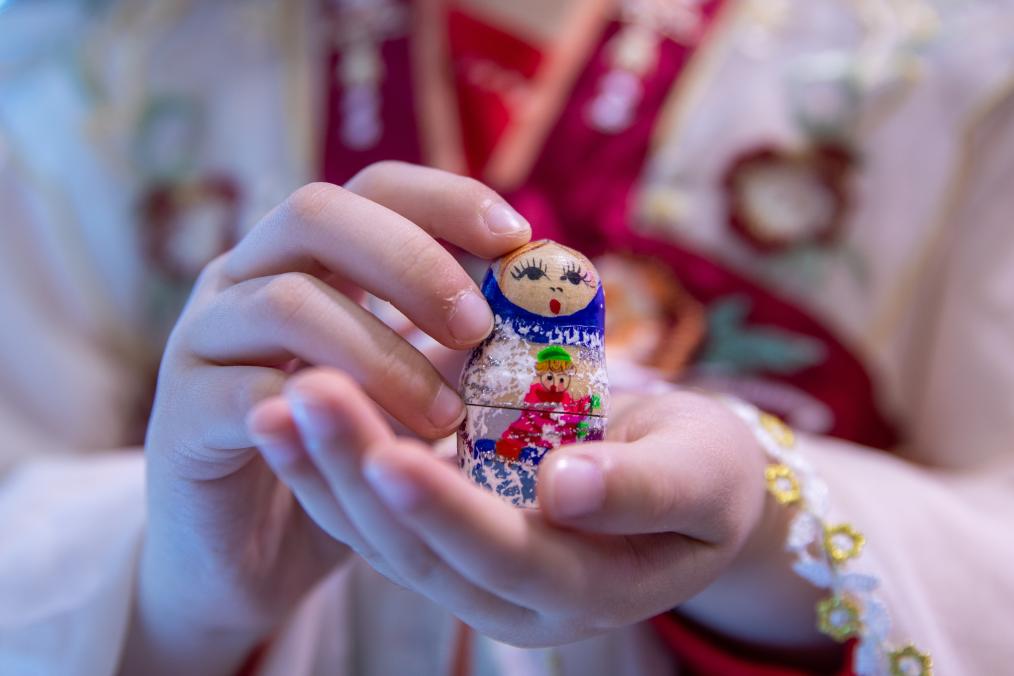 5月19日,在第八届中俄博览会现场,一名小朋友展示俄罗斯套娃。新华社记者 张涛 摄