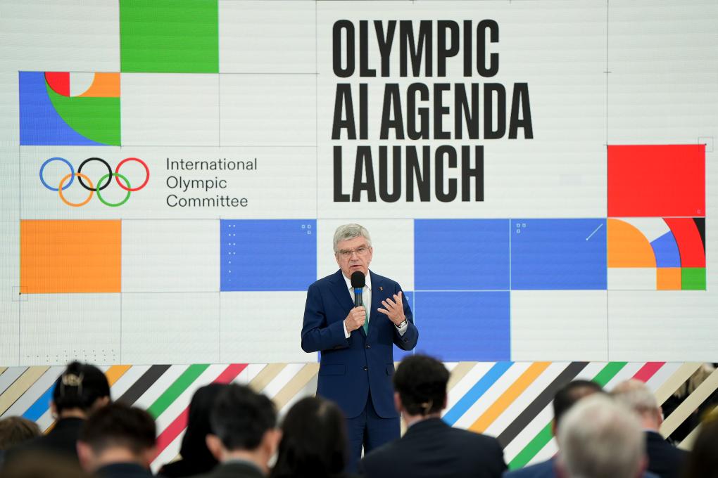4月19日,国际奥委会主席巴赫在《奥林匹克AI议程》发布会上讲话。新华社记者 吴鲁 摄