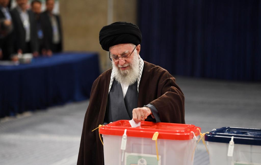3月1日,在伊朗首都德黑兰,伊朗最高领袖哈梅内伊在设于领袖府内的投票站参加伊朗议会选举投票。新华社记者沙达提 摄