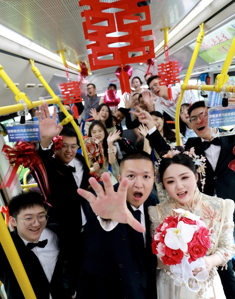 新华社重庆5月20日电 公交车窗贴着“囍”字窗花,车厢内也布满 “囍”字挂饰,近日,重庆涪陵街头的一辆“公交婚车”引发关注。在亲朋好友见证下,两位新人坐上这辆特别的婚车,向幸福出发!