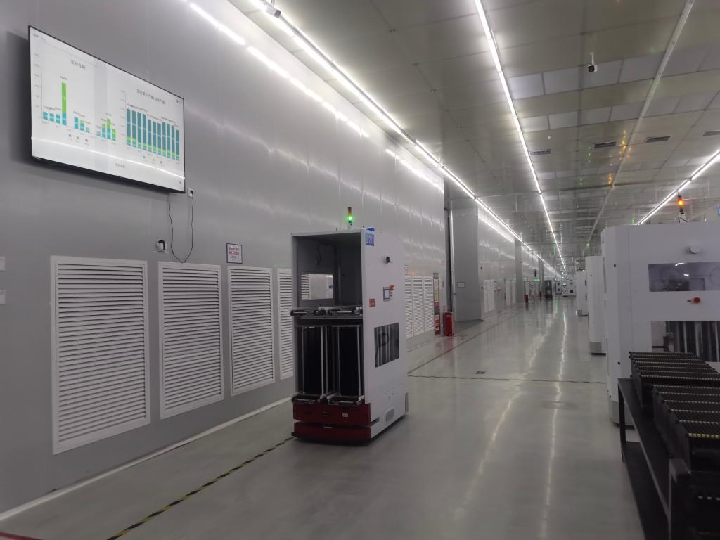在滁州市来安县滁州捷泰新能源科技有限公司,机器人小车穿梭在车间。新华社记者水金辰 摄