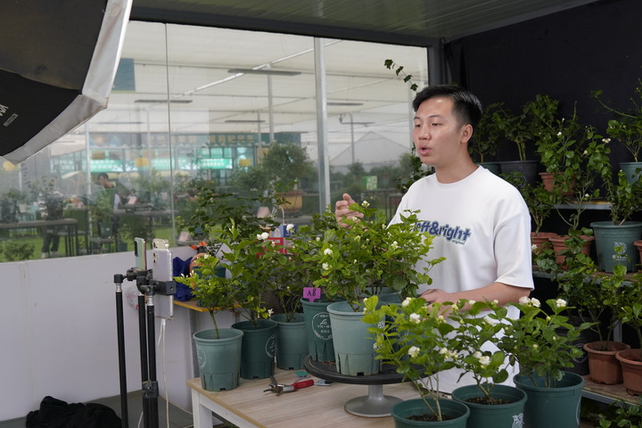 横州年轻人通过直播带货、网店等形式向外销售茉莉花盆栽。新华社记者 赵欢 摄