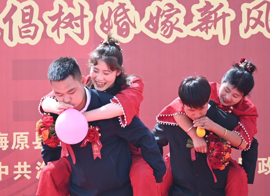 5月20日,在宁夏中卫市海原县举办的中式集体婚礼上,新娘王兰(左二)和丈夫(左一)在游戏互动环节吹气球。新华社发