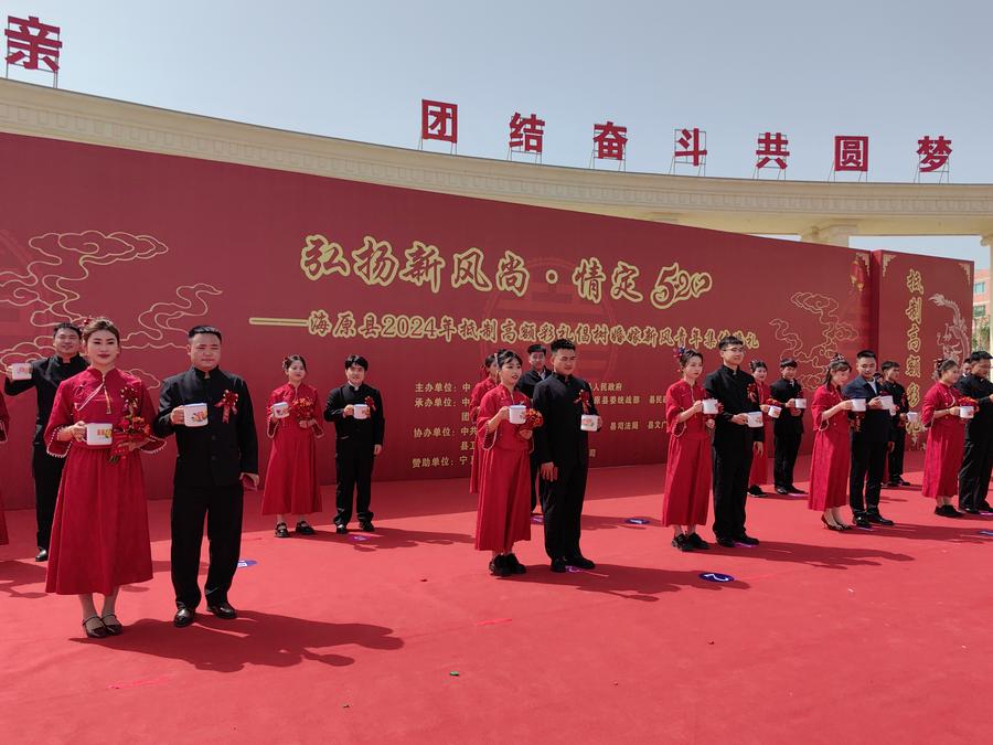 5月20日,因中文谐音“我爱你”,被人们赋予寓意美好爱情的浪漫和仪式感,不少人选择在这天表白、领证、办婚礼。当日,宁夏、江苏、湖南、山东等地专门为新婚青年集体办婚礼,给幸福“加码”。在海原县一广场上,王兰等11对新婚夫妇在当地政府部门组织下,举行了一场具有年代感的中式集体婚礼。