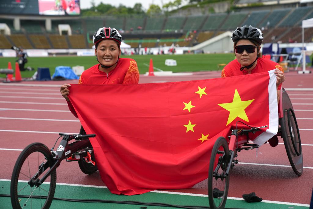 5月22日,中国选手周洪转(左)和队友高芳在女子100米T53级别决赛后合影。新华社记者 张笑宇 摄