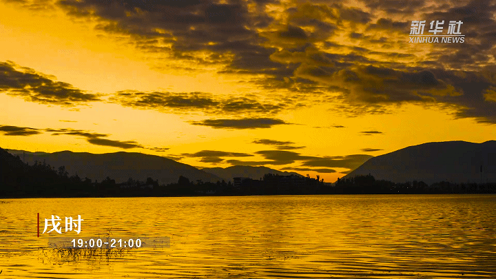 酉时(17:00-19:00),晚霞似火,绚彩流金。茈碧湖畔的草海湿地,人游画中,观鹭赏荷,人与自然和谐共生。