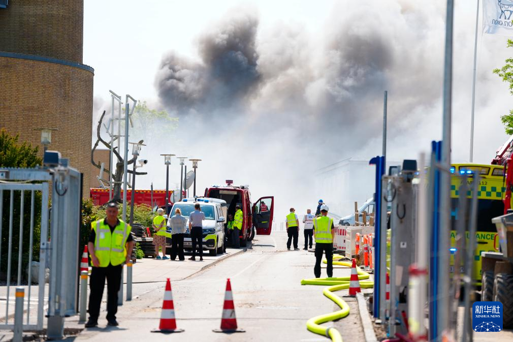 5月22日,在丹麦鲍斯韦市,消防员在火灾现场附近工作。新华社/美联