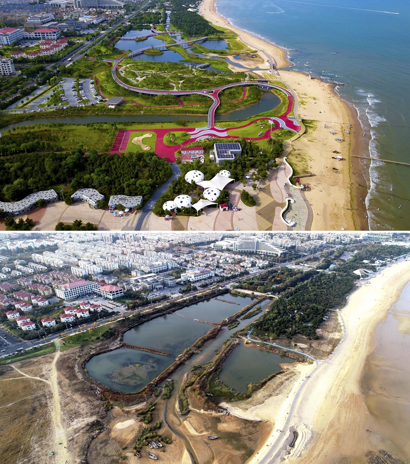 这是一张拼版照片,上图为2021年拍摄的生态修复完成后的山东日照市阳光海岸绿道,该绿道长28公里(无人机照片);下图为2019年11月拍摄的日照市阳光海岸绿道未经生态修复时的样子。新华社记者 郭绪雷 摄