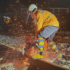 在宁启铁路海安站北面岔区,铁路养护工人在切割钢轨。新华社记者朱国亮 摄