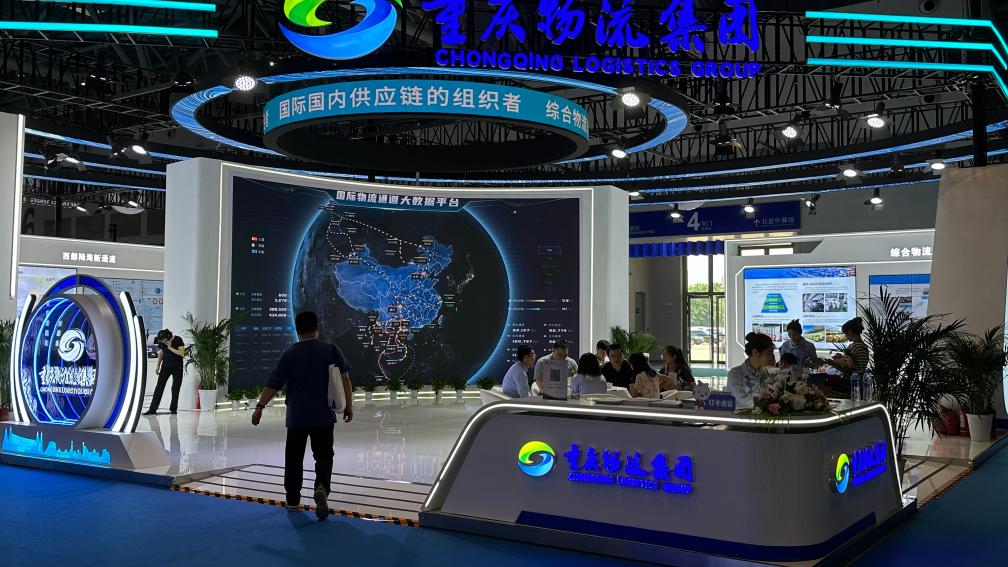5月23日至26日在第六届中国西部国际投资贸易洽谈会(西洽会)上,重庆物流集团展区内的一张环形电子大屏引人注目,经重庆口岸的各类国际物流通道大数据在这里实时更新、分析汇总。