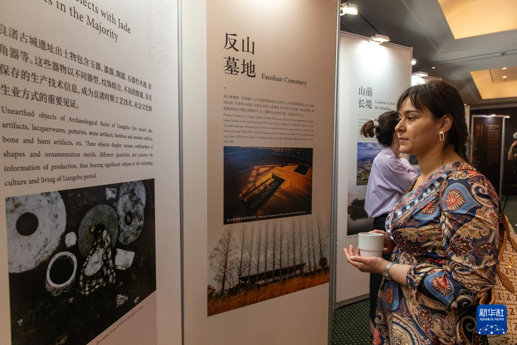 5月24日,在希腊雅典举办的“良渚古城·雅典卫城”文明对话交流活动上,一名女子参观良渚文化主题展览。新华社发(马里奥斯·罗洛斯摄)