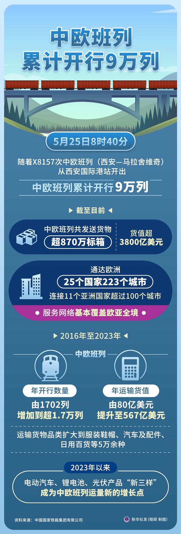 新华社西安5月25日电 5月25日8时40分,随着X8157次中欧班列(西安—马拉舍维奇)从西安国际港站开出,中欧班列累计开行9万列。