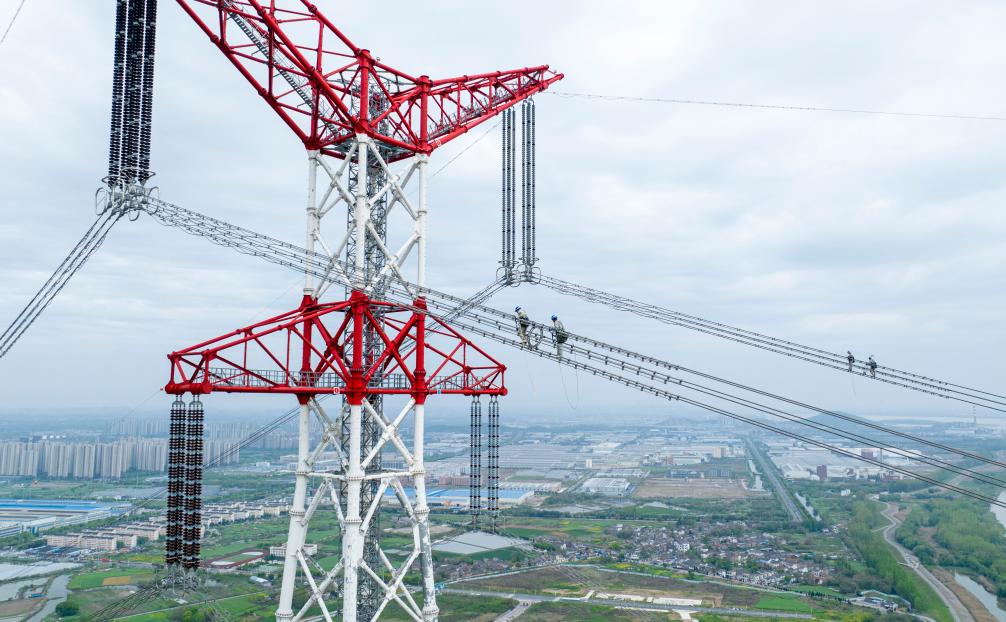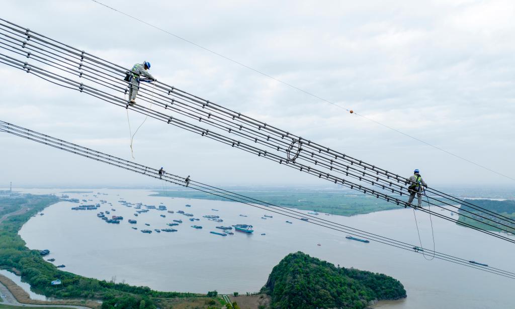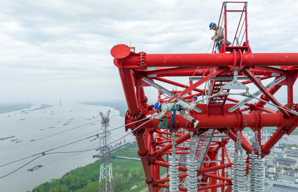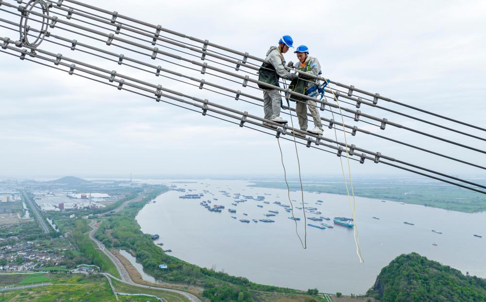 安徽送变电工程有限公司检修工人在高空检修±800千伏建苏线跨江通道(4月10日摄,无人机照片)。