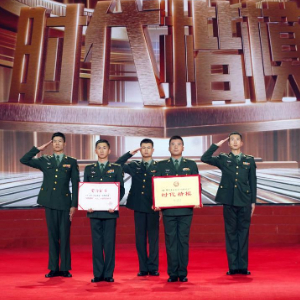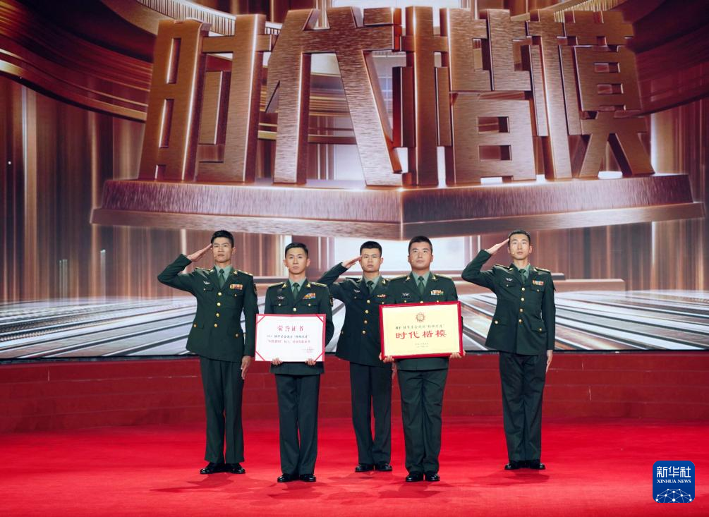 在“时代楷模”发布仪式上,陆军某合成旅“杨根思连”官兵代表领取“时代楷模”奖牌和证书(4月28日摄)。新华社记者 张永进 摄