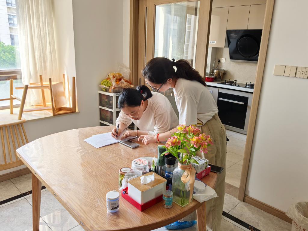 2024年5月17日,江苏省太仓市城市发展集团有限公司员工在都会之光小区袁女士家中进行“以旧换新”验房工作,引导袁女士填写验房确认单。(薛宇涛 摄)