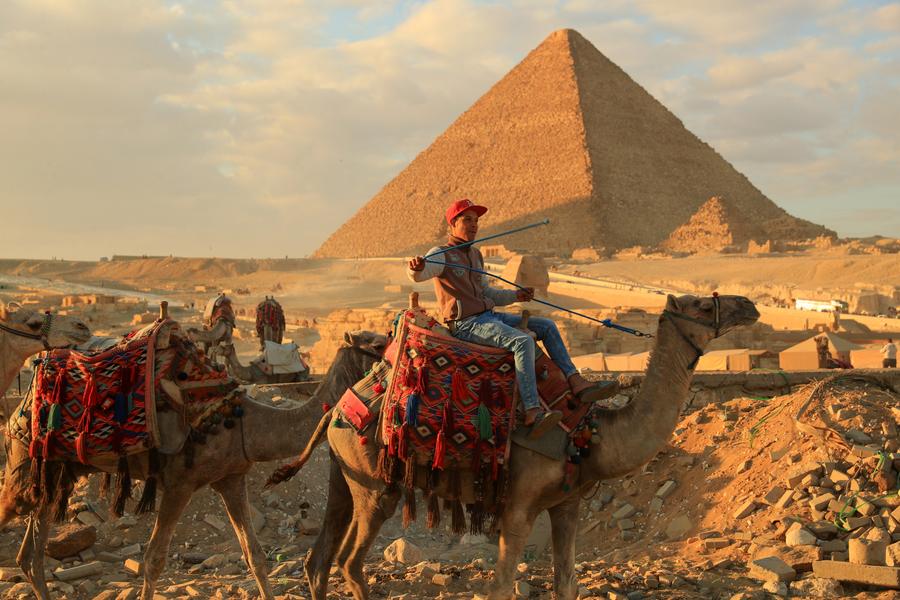 1月24日,商贩骑骆驼离开埃及吉萨金字塔景区。新华社记者 隋先凯 摄