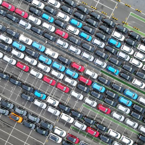 上海外高桥海通汽车码头等待装船运往澳大利亚的上汽MG品牌汽车(2023年7月9日摄,无人机照片)。新华社记者 方喆 摄