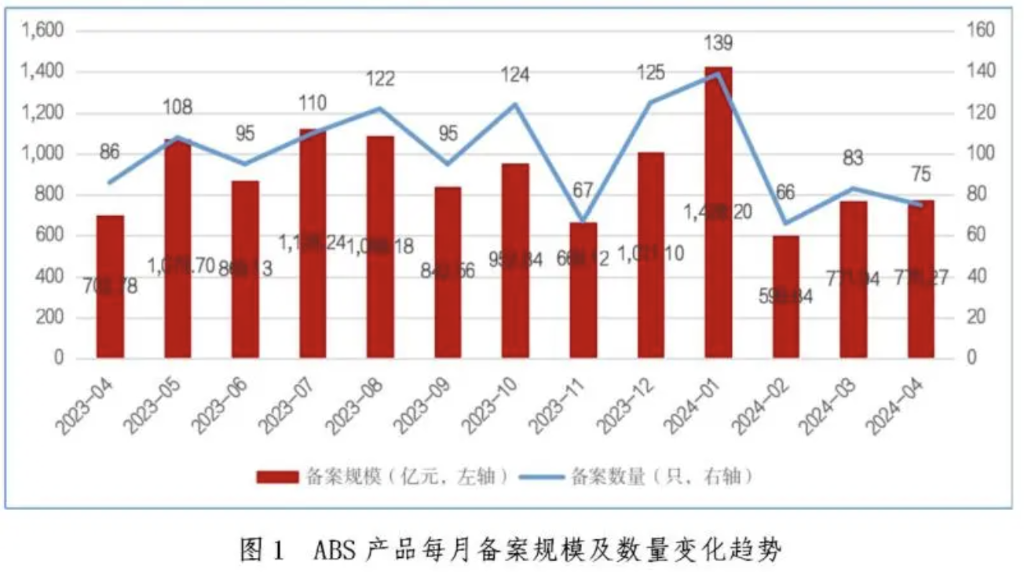 中国基金业协会日前发布的数据显示,2024年4月,企业资产证券化产品共备案确认75只,新增备案规模合计775.27亿元。4月新增备案规模环比增长0.43%,同比增长10%。