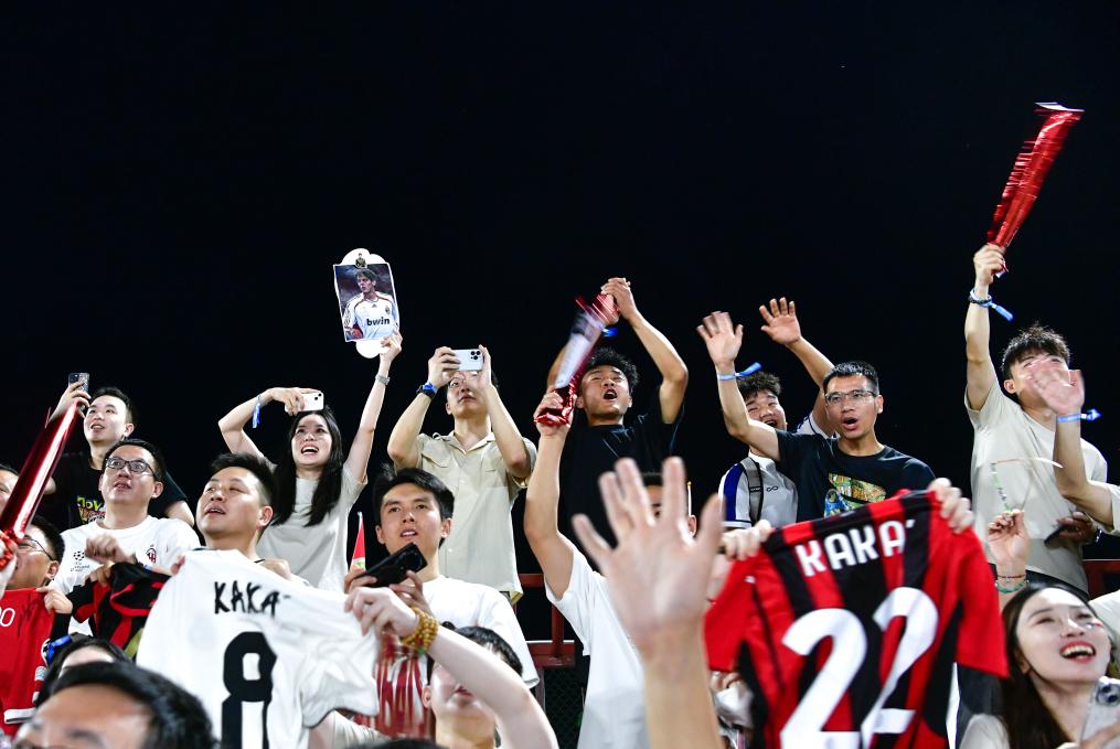没有在观众席上抢到一席之地的球迷们,便在现场转播大屏前席地而坐,睁大双眼,不想错过比赛的每一个精彩瞬间。卡卡进球后双手指天的庆祝动作,更是让现场观众直呼“我的青春又回来了”。