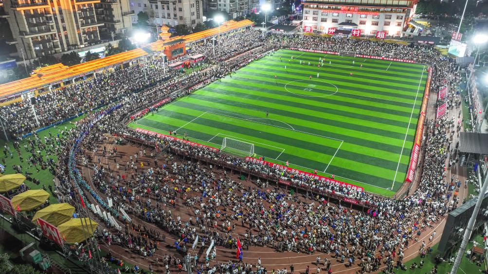 27日晚,国际足球巨星卡卡来到贵州榕江“村超”现场,参加2024“逐梦”冠军公益赛,奔赴一场与榕江“逐梦”青少年女足的足球之约。来自也门的贵州大学留学生阿尔法感叹道:“这次‘村超’的氛围特别好,人也特别多。”