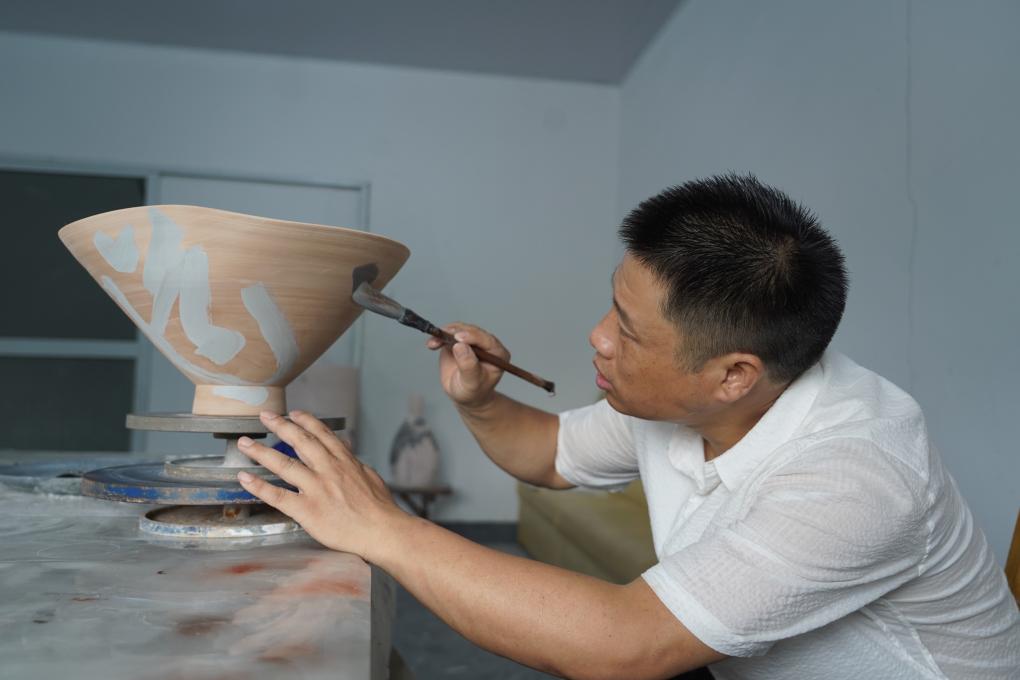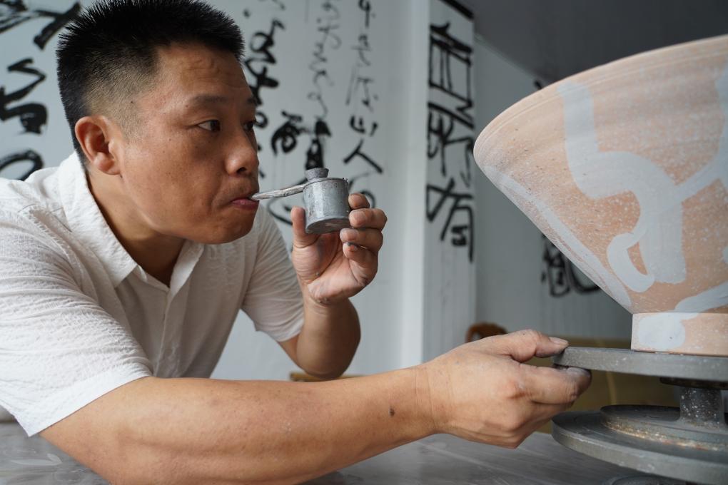 尹志军在“字非字”陶瓷书法非遗工作室内进行吹釉工序。(王凯丰 摄)