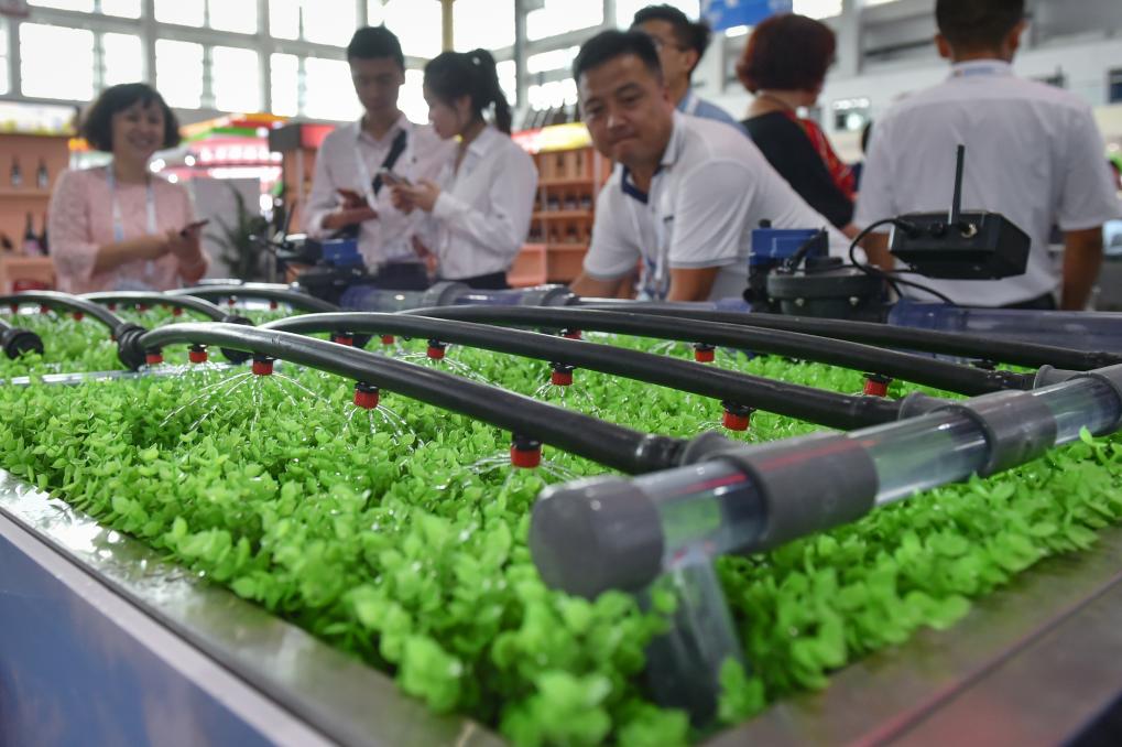2019年9月5日,在第四届中国-阿拉伯国家博览会高新技术与装备展上,观众参观一款基于农业物联网技术的水肥智能化灌溉系统。新华社记者 李芒茫 摄