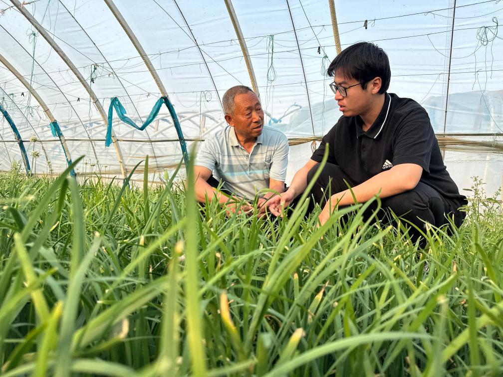 在山东省滨州市滨城区三河湖镇大营刘村,李圣超与村干部交流韭菜生长情况。新华社记者 王阳 摄