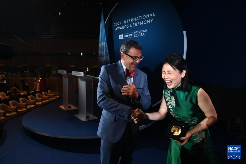 5月28日,在位于法国巴黎的联合国教科文组织总部,中国科学家颜宁(右)出席“世界杰出女科学家奖”颁奖典礼。新华社发(朱利安·马蒂亚摄)