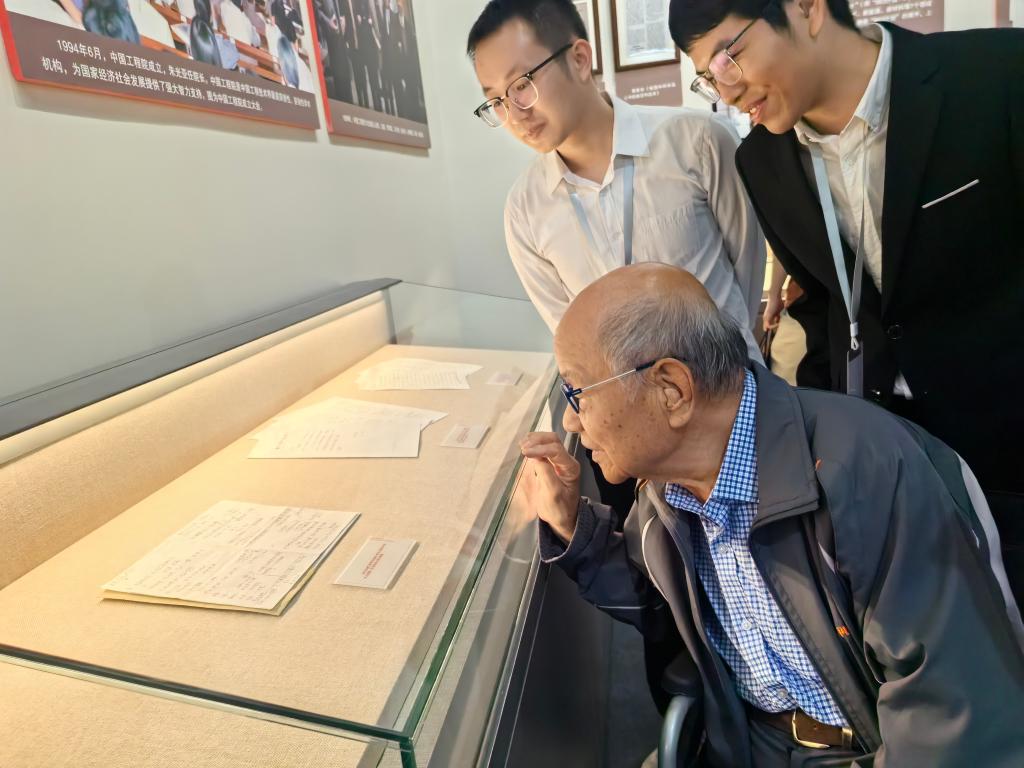 5月30日,中国工程院院士倪维斗在中国科学家博物馆首展上看到自己曾经的笔记。(中国科协科学技术传播中心供图)
