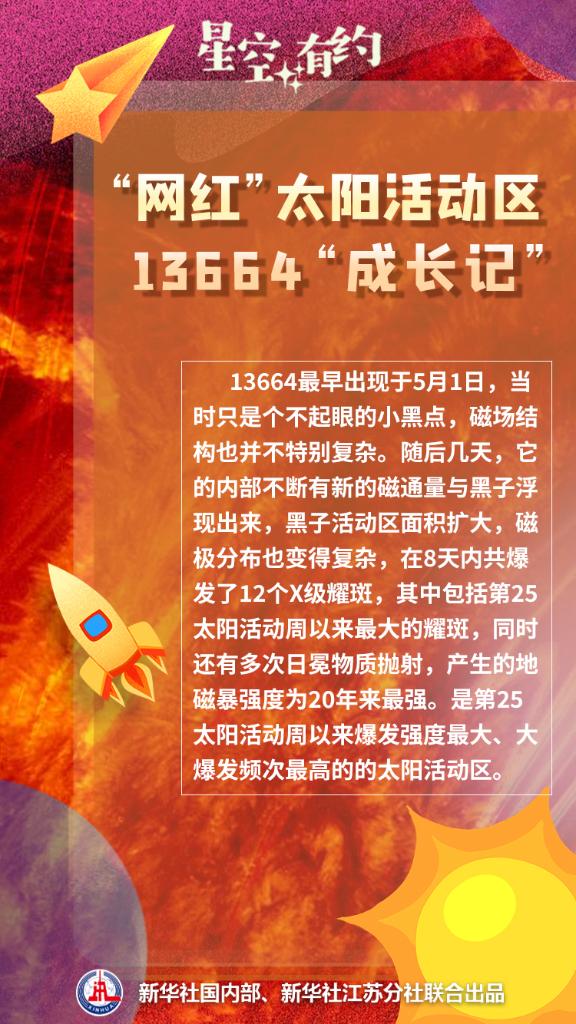 中国科学院紫金山天文台科普主管王科超介绍,13664最早出现于5月1日,当时只是个不起眼的小黑点,磁场结构也并不特别复杂,没有过多受到关注。随后几天,它的内部不断有新的磁通量与黑子浮现出来,黑子活动区面积扩大,磁极分布也变得复杂,在8天内共爆发了12个X级耀斑,其中包括第25太阳活动周以来最大的耀斑,同时还有多次日冕物质抛射,产生的地磁暴强度为20年来最强。可以说,13664是第25太阳活动周以来爆发强度最大、大爆发频次最高的太阳活动区。