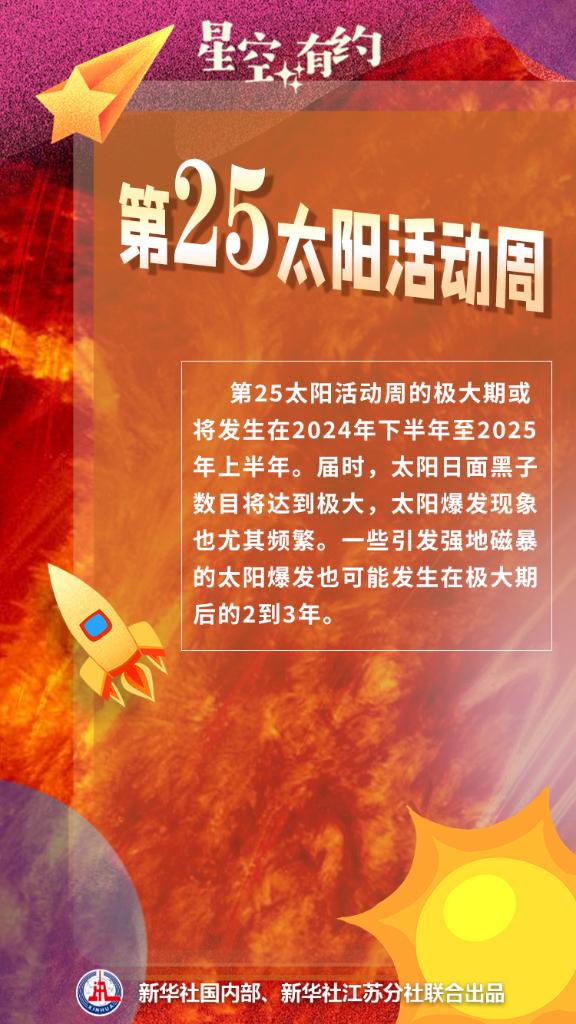 “太阳目前正处于第25个活动周期,极大期或将发生在2024年下半年至2025年上半年。”滕伟霖说,这里所说的极大,是指届时太阳日面黑子数目将达到极大。在此期间,最具代表性的现象就是太阳耀斑和日冕物质抛射这两类太阳上剧烈的爆发现象。大部分强耀斑爆发和剧烈的日冕物质抛射都来自太阳活动区。根据以往经验,一些引发强地磁暴的太阳爆发也可能发生在极大期后的2至3年。