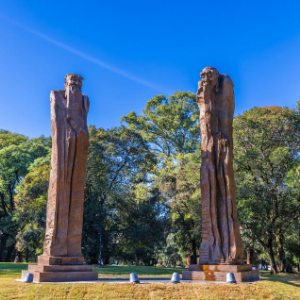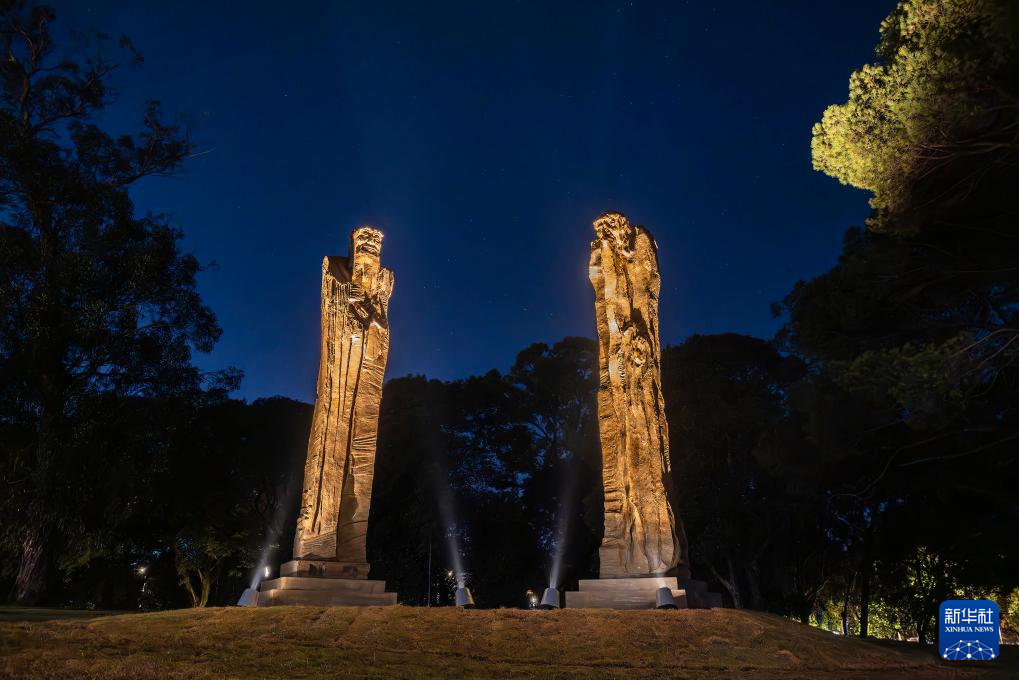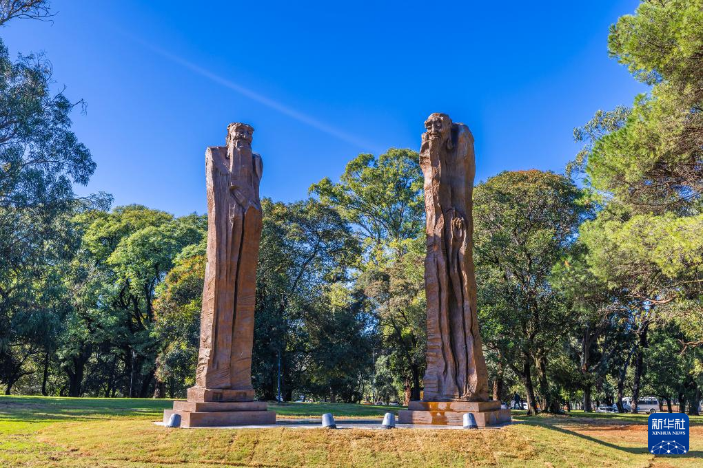 这是5月28日在乌拉圭首都蒙得维的亚市中心的巴特列公园拍摄的雕塑作品《问道》。新华社发(陈曦摄)