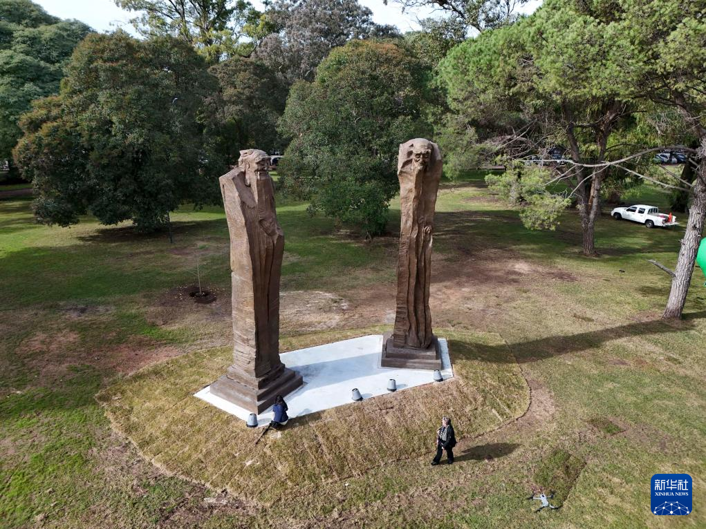 这是5月29日在乌拉圭首都蒙得维的亚市中心的巴特列公园拍摄的雕塑作品《问道》(无人机照片)。新华社发(尼古拉斯·塞拉亚摄)