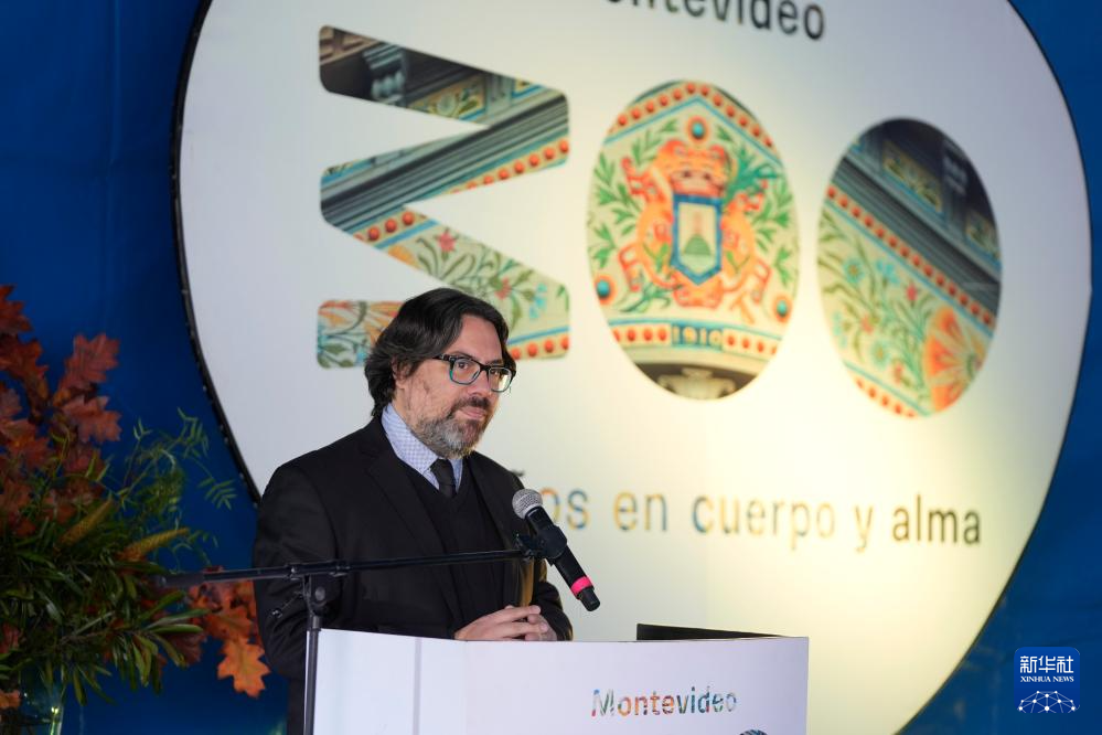 5月29日,乌拉圭蒙得维的亚市长毛里西奥·苏尼诺在巴特列公园举行的雕塑作品《问道》揭幕仪式上致辞。新华社发(尼古拉斯·塞拉亚摄)