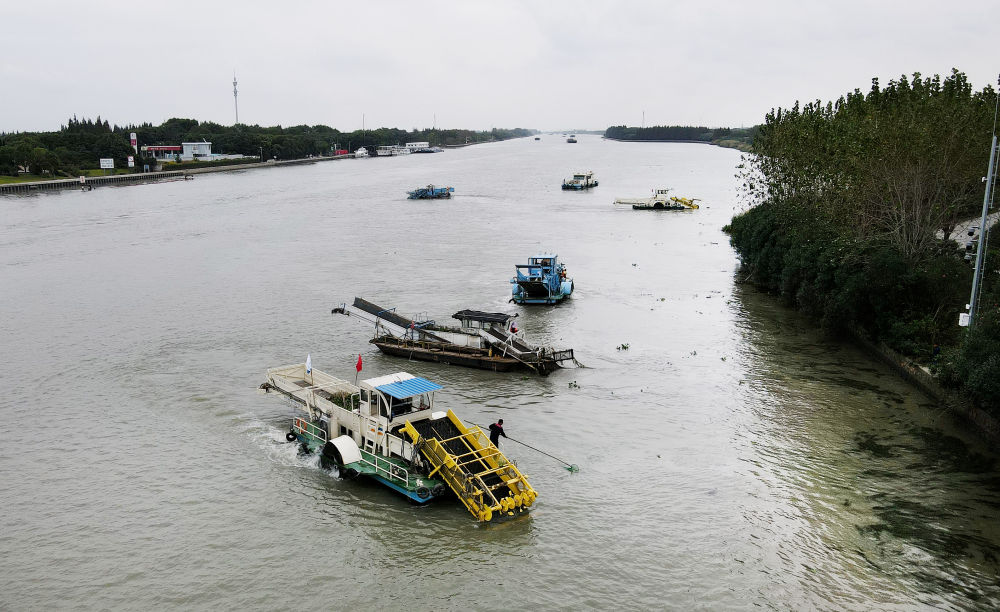 苏浙沪三地的保洁船在苏浙沪交界水域太浦河流域联合清理水面浮游植物(2020年10月15日摄,无人机照片)。新华社记者 方喆 摄