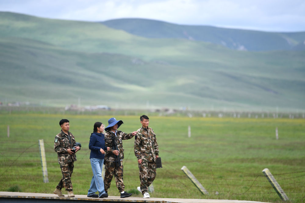 在位于甘肃甘南藏族自治州的尕海则岔国家级自然保护区,管护中心尕海保护站的工作人员在保护区内巡护(2023年7月7日摄)。甘肃省甘南藏族自治州是黄河、长江上游重要的水源涵养和补给区,拥有世界上保存最完好、生态功能最完善的湿地之一。新华社记者 陈斌 摄
