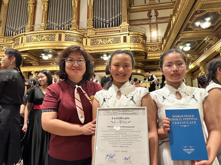 2023年7月23日,东坝童声合唱团班琴(中)在维也纳金色大厅,左为沈阳日报童声合唱团团长浴辉。徐小凌摄