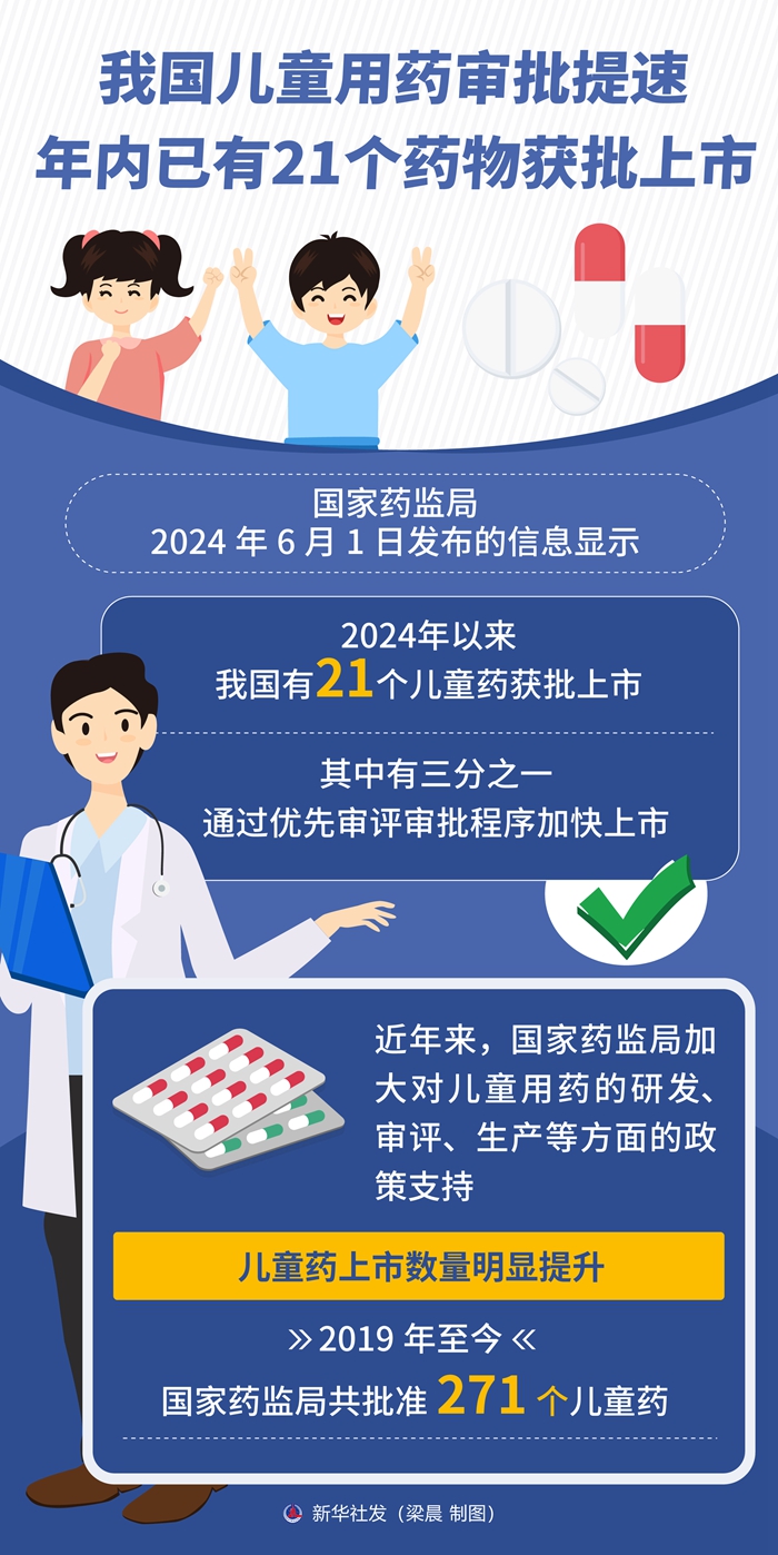 新华社北京6月1日电(记者戴小河)国家药监局1日发布的信息显示,2024年以来我国有21个儿童药获批上市,其中有三分之一通过优先审评审批程序加快上市。