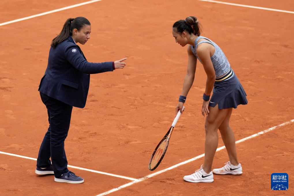 6月1日,郑钦文(右)在比赛中与裁判交流。新华社记者 孟鼎博 摄