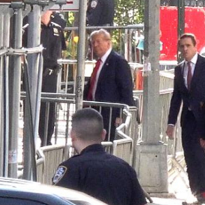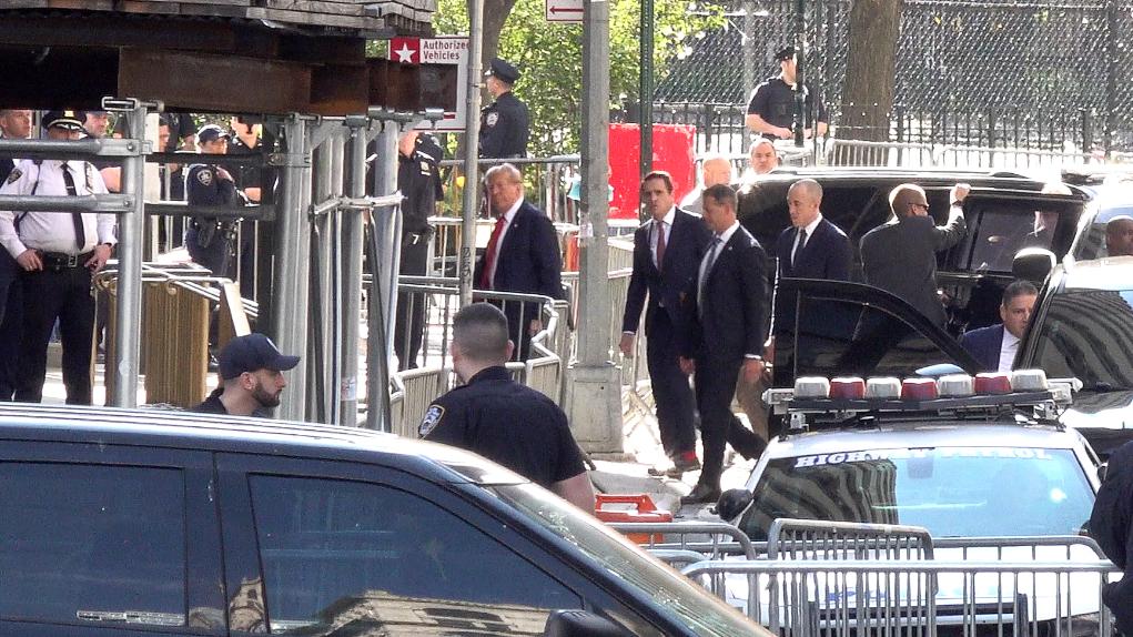 这张4月15日的视频截图显示,美国前总统特朗普抵达纽约曼哈顿一家刑事法院出庭。新华社记者丁晔摄
