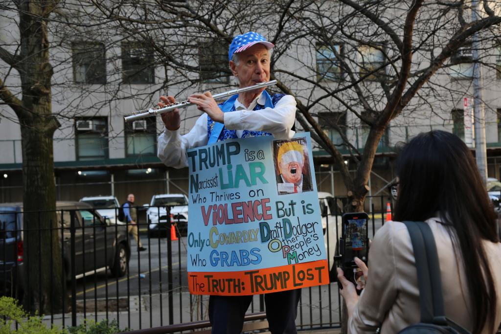 4月15日,在美国纽约,美国前总统特朗普的反对者在法庭前的公园挂着标语牌演奏乐器。新华社记者刘亚南摄