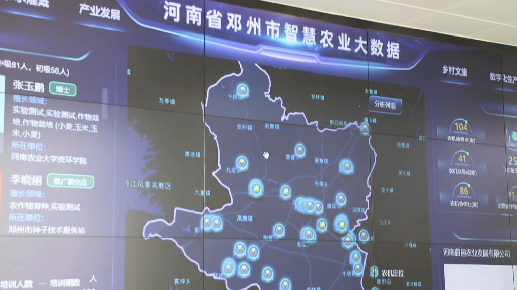 在邓州市智慧农业中心的大屏幕上,密密麻麻的小点为全市收割机的调动作业和维修服务提供了大数据支撑。