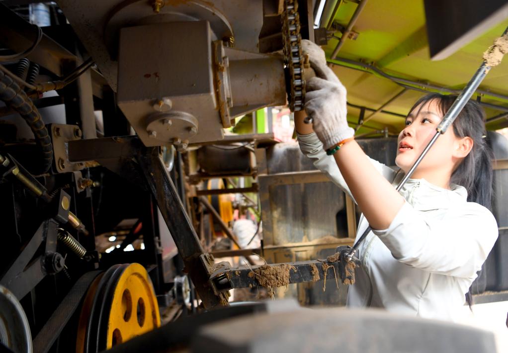 5月30日,在河南省平顶山市鲁山县马楼乡关庙杜村,杜梦园在检修收割机,准备跨区作业。新华社记者 郝源 摄