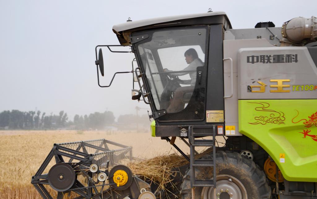 5月29日,在河南省平顶山市鲁山县马楼乡关庙杜村,杜梦园驾驶收割机收割小麦。新华社记者 郝源 摄