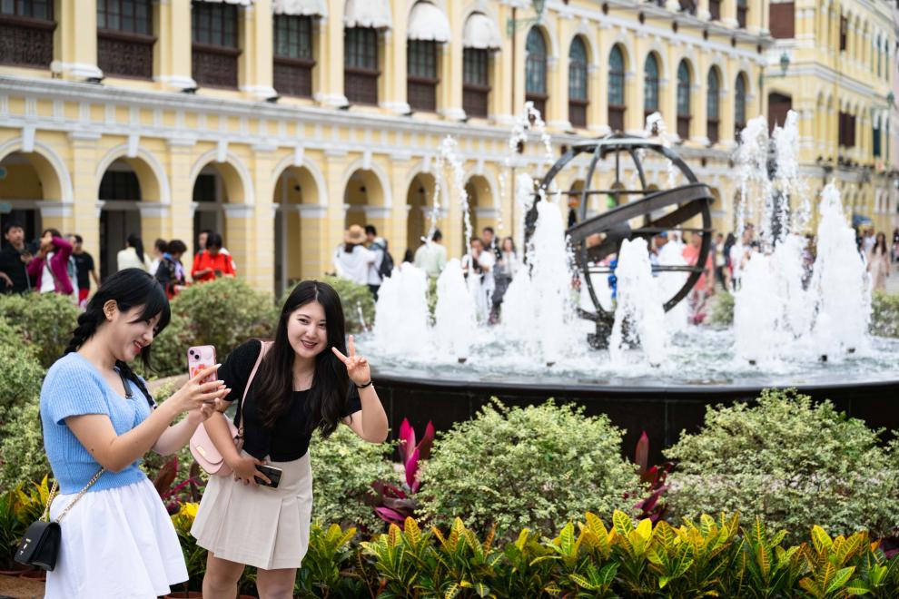 5月1日,游客在澳门议事亭前地游览、拍照。新华社记者 张金加 摄