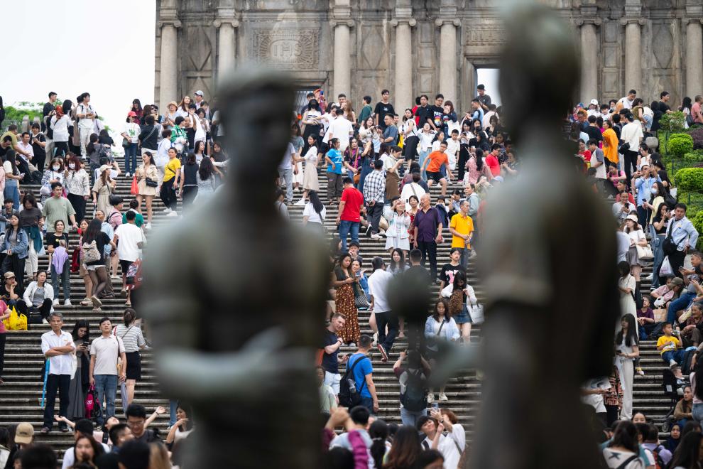 5月1日,游客在澳门大三巴牌坊前游览。新华社记者 张金加 摄