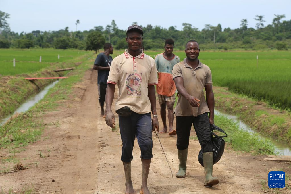 5月31日,在位于科特迪瓦南部迪沃省的格格杜垦区,当地种植户在水稻田边的道路上行走。新华社记者 张健 摄