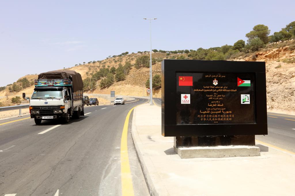 5月27日,在约旦萨尔特,车辆驶过萨尔特公路旁设立的中国援约旦萨尔特公路升级改造项目纪念碑。新华社发(穆罕默德·阿布·古什摄)