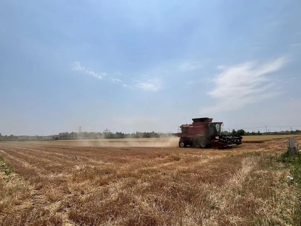 孟夏时节,在山东德州武城县李家户镇刘王庄村,小麦联合收割机在田里来回穿梭,前面“吃进去”小麦,后面将粉碎的秸秆均匀抛洒还田,为下一季玉米播种做好准备。